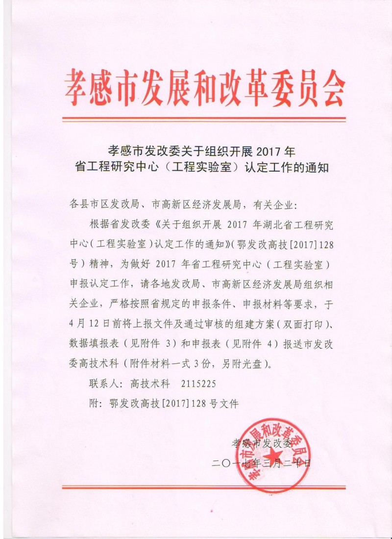 孝感市發(fā)改委關于組織開展2017年省工程研究中心(工程實驗室)認定工作的通知